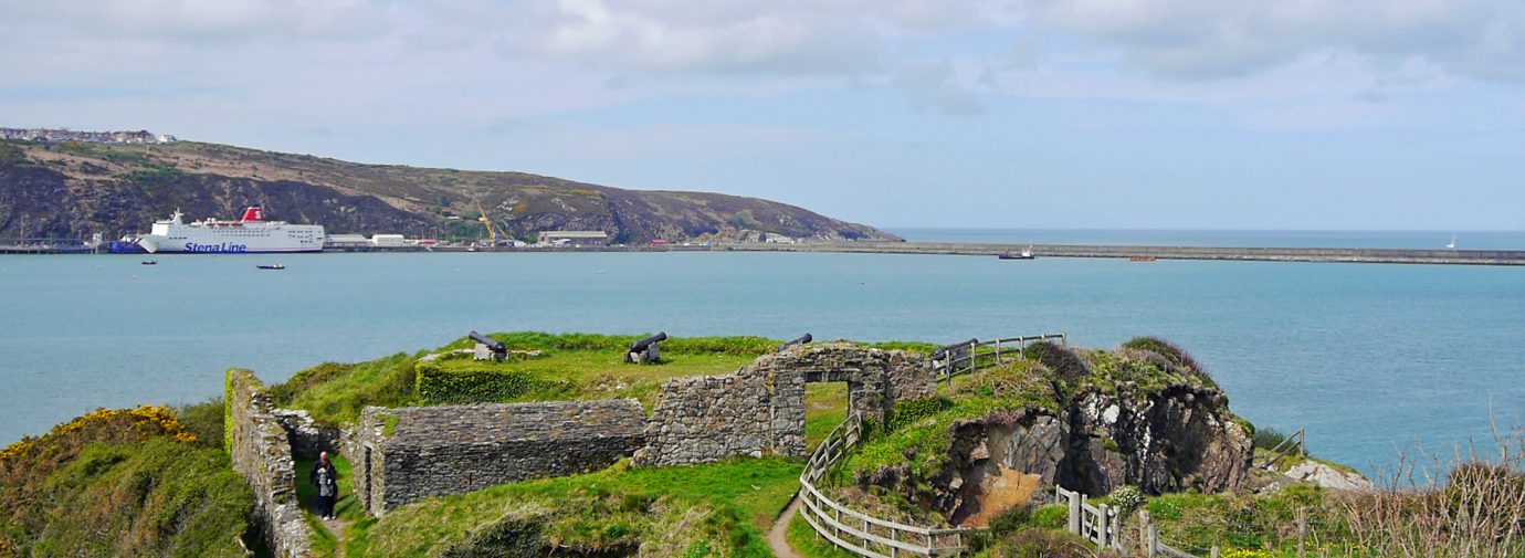 Ar ôl 70m pellach o lethr hamddenol tuag i lawr mae yna olygfan yn edrych allan dros y Gaer a’r Bae.