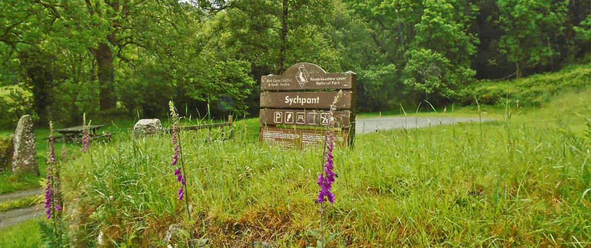 Trowch i’r chwith allan o’r maes parcio arno i’r heol. Dilynwch yr heol ac ar ôl iddi droi i’r dde, chwiliwch am fynegbost sy’n pwyntio ymlaen a chymerwch y llwybr i’r coed.