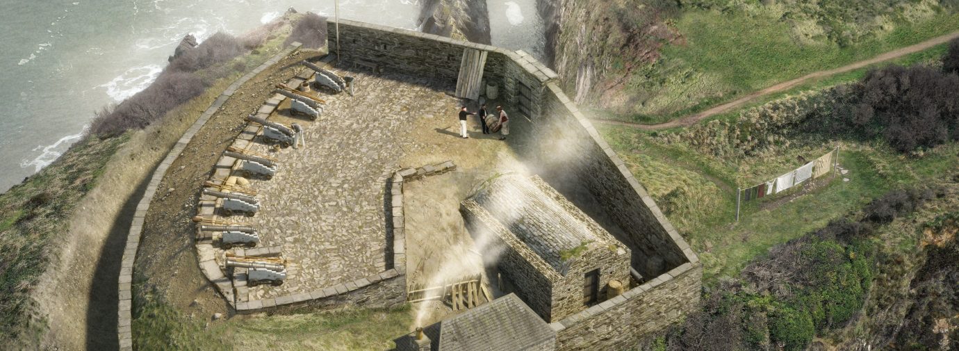Adluniad 3D o Gaer Abergwaun fel y gallai fod wedi edrych yn 1797, adeg y Goresgyniad Olaf.